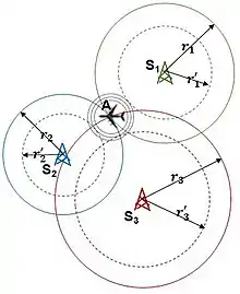 Satellite navigation systems such as GPS are the most prominent examples of 3-D multilateration.[3][4] Wide Area Multilateration (WAM), a 3-D aircraft surveillance system, employs a combination of three or more TOA measurements and an aircraft altitude report.
