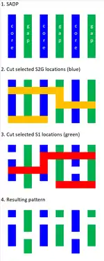 Self-aligned blocking or cutting is currently being targeted for use with SAQP for sub-30 nm pitches.[76] The lines to be cut are divided into two materials, which can be etched selectively. One cut mask only cuts every other line made of one material, while the other cut mask cuts the remaining lines made of the other material. This technique has the advantage of patterning double pitch features over lines at the minimum pitch, without edge placement errors.[34]