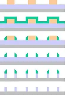 The main issues with the spacer approach are whether the spacers can stay in place after the material to which they are attached is removed, whether the spacer profile is acceptable, and whether the underlying material is attacked by the etch removing the material attached to the spacer. Pattern transfer is complicated by the situation where removal of the material adjacent to the spacers also removes a little of the underlying material. This results in higher topography on one side of the spacer than the other.[44] Any misalignment of masks or excursion in pre-patterned feature critical dimension (CD) will cause the pitch between features to alternate, a phenomenon known as pitch walking.[45]