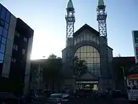 The original iron and glass[9] building is in the Jugendstil-style. It measures 1,500 square metres (16,000 sq ft) in size with towers which rise 47 metres (154 ft). The varnished roof is of natural pine; it is treated with synthetic rubber for waterproofing.
