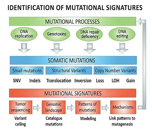 Mutational signatures are characteristic combinations of mutation types arising from specific mutagenesis processes such as DNA replication infidelity, exogenous and endogenous genotoxins exposures, defective DNA repair pathways and DNA enzymatic editing.[1]