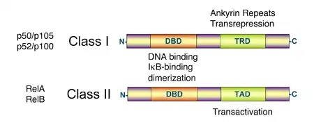 All proteins of the NF-κB family share a Rel homology domain in their N-terminus. A subfamily of NF-κB proteins, including RelA, RelB, and c-Rel, have a transactivation domain in their C-termini. In contrast, the NF-κB1 and NF-κB2 proteins are synthesized as large precursors, p105, and p100, which undergo processing to generate the mature NF-κB subunits, p50 and p52, respectively. The processing of p105 and p100 is mediated by the ubiquitin/proteasome pathway and involves selective degradation of their C-terminal region containing ankyrin repeats. Whereas the generation of p52 from p100 is a tightly regulated process, p50 is produced from constitutive processing of p105.[14][15] The p50 and p52 proteins have no intrinsic ability to activate transcription and thus have been proposed to act as transcriptional repressors when binding κB elements as homodimers.[16][17] Indeed, this confounds the interpretation of p105-knockout studies, where the genetic manipulation is removing an IκB (full-length p105) and a likely repressor (p50 homodimers) in addition to a transcriptional activator (the RelA-p50 heterodimer).
