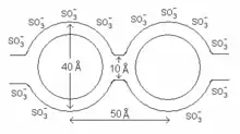 The first model for Nafion, called the cluster-channel or cluster-network model, consisted of an equal distribution of sulfonate ion clusters (also described as 'inverted micelles'[4]) with a 40 Å (4 nm) diameter held within a continuous fluorocarbon lattice. Narrow channels about 10 Å (1 nm) in diameter interconnect the clusters, which explains the transport properties.[3][4][13]