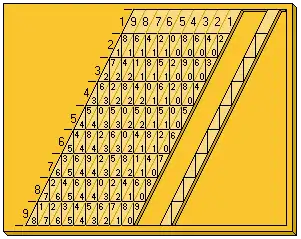During the 19th century, Napier's bones were transformed to make them easier to read. The rods were made with an angle of about 65° so that the triangles that had to be added were aligned vertically. In this case, in each square of the rod the unit is to the right and the ten (or the zero) to the left.