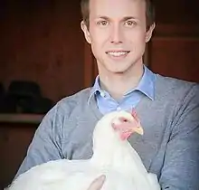 ![]() Milo Runkle, founder and executive director of Mercy For Animals, holds a hen rescued from a factory farm. | |
