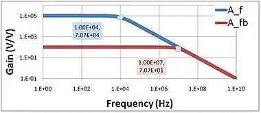 where fC is the cutoff or corner frequency of the amplifier: in this example fC = 104 Hz, and the gain at zero frequency A0 = 105 V/V. The figure shows that the gain is flat out to the corner frequency and then drops. When feedback is present, the so-called closed-loop gain, as shown in the formula of the previous section, becomes