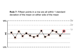 | Fifteen points in a row are all within 1 standard deviation of the mean on either side of the mean. | ![]() | With 1 standard deviation, greater variation would be expected. | |