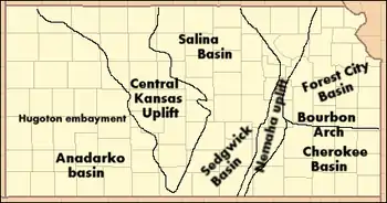 Along the Nemaha Ridge is a series of faults referred to as the "Nemaha Fault Zone".[2][3] The long term uplift along the ridge has been attributed to isostatic uplift due to the anomalously thick crust adjacent to the Midcontinent Rift.[4]