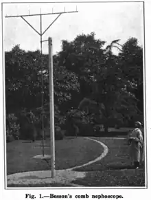 Developed by Louis Besson director of the Observatory of Montsouris in 1912 this apparatus consists of a horizontal bar fitted with several equidistant spikes and mounted on the upper end of a vertical pole which can be rotated on its axis. When an observation is to be made the observer places himself in such a position that the central spike is projected on any chosen part of a cloud. Then, without altering his position, he causes the "comb" to turn by means of two cords in such a manner that the cloud is seen to follow along the line of spikes. A graduated circle, turning with the vertical pole, gives the direction of the cloud's motion ; it is read with the aid of a fixed pointer. Moreover, when the apparatus is once oriented, the observer can determine the relative speed of the cloud by noting the time the latter requires to pass from one spike to the next. If the instrument stands on level ground, so that the observer's eye is always at the same height, and if the interval between two successive spikes is equal to one tenth of their altitude above the eye-level of the observer, one need only multiply by 10 the time required for the cloud to pass over one interval to determine the time the cloud travels a horizontal distance equal t.o its altitude.