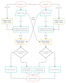 Unlike a local game where the inputs of all players are executed instantly in the same simulation or instance of the game, in an online game there are several parallel simulations (one for each player) where the inputs from their respective players are received instantly, while the inputs for the same frame from other players arrive with a certain delay (greater or lesser depending on the physical distance between the players, the quality and speed of the players' network connections, etc.).[5] During an online match, games must receive and process players' input within a certain time for each frame (e.g. 16 ms at 60 FPS), and if a remote player's input of a particular frame (for example, of frame number 10) arrives when another one is already running (for example, in frame number 20, 160 ms later), desynchronization between player simulations is produced. There are two main solutions to resolving this conflict and making the game run smoothly: