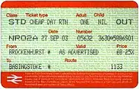 A larger and more controversial change occurred as from 2 June 2002,[4] when the discount level was changed: a minimum adult fare of £10.00 was imposed for weekday journeys, and children now received an 81% discount[5] on the full adult fare (equivalent to a 60% on the full child fare,[6] and subject to a minimum fare of £1.00) instead of the former £1.00 flat fare for all journeys. This meant that on a weekday, holders would receive no discount if the standard adult full fare was £10.00 or less, and a discount of less than 34% on fares between £10.05 and £15.00. Longer journeys for children would also become more expensive. Transport pressure group Transport 2000 and environmental organisation Friends of the Earth condemned the proposals,[7] and Reading East MP Jane Griffiths tabled an Early Day Motion in the British Parliament opposing the changes. This gained the support of 38 other MPs from all major parties.[7] Research commissioned by Transport 2000 indicated that 90% of journeys typically made in the railcard area would no longer gain any discount (as a result of the full adult fare being £10.00 or below), a further 3.5% would attract a discount of less than 34%, and only 6.5% would still be subject to the full 34% discount as before.[8] This reflects the fact that many journeys undertaken in the area are short and "local" in nature, and that the area as a whole is fairly small in size (as the map shows,[9] it does not extend a very long way from London in any direction).