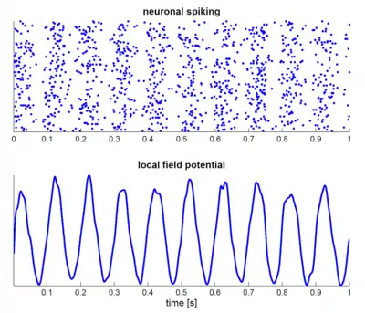 A group of neurons can also generate oscillatory activity. Through synaptic interactions, the firing patterns of different neurons may become synchronized and the rhythmic changes in electric potential caused by their action potentials will add up (constructive interference). That is, synchronized firing patterns result in synchronized input into other cortical areas, which gives rise to large-amplitude oscillations of the local field potential. These large-scale oscillations can also be measured outside the scalp using electroencephalography (EEG) and magnetoencephalography (MEG). The electric potentials generated by single neurons are far too small to be picked up outside the scalp, and EEG or MEG activity always reflects the summation of the synchronous activity of thousands or millions of neurons that have similar spatial orientation.[20] Neurons in a neural ensemble rarely all fire at exactly the same moment, i.e. fully synchronized. Instead, the probability of firing is rhythmically modulated such that neurons are more likely to fire at the same time, which gives rise to oscillations in their mean activity (see figure at top of page). As such, the frequency of large-scale oscillations does not need to match the firing pattern of individual neurons. Isolated cortical neurons fire regularly under certain conditions, but in the intact brain cortical cells are bombarded by highly fluctuating synaptic inputs and typically fire seemingly at random. However, if the probability of a large group of neurons is rhythmically modulated at a common frequency, they will generate oscillations in the mean field (see also figure at top of page).[19] Neural ensembles can generate oscillatory activity endogenously through local interactions between excitatory and inhibitory neurons. In particular, inhibitory interneurons play an important role in producing neural ensemble synchrony by generating a narrow window for effective excitation and rhythmically modulating the firing rate of excitatory neurons.[21]