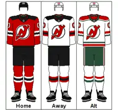 The team colors are red, black and white, and they can be seen on both the home and road jerseys. The home jersey, which was the team's road jersey until the NHL swapped home and road colors in 2003,[159] is dominantly red in color. There are three black and white stripes, one across each arm and one across the waist. The road jersey (the team's former home jersey) is white in color with a similar design, except that the three stripes are black and red. The shoulders are draped with black on both uniforms. Before the 1992–93 season, the uniforms were green and red with slightly different striping,[160] leading some fans to affectionately refer to them as "Christmas colors."[161] The Devils have yet to introduce a third jersey and are one of only two NHL teams (Detroit is the other) never to have worn one.[162] Lamoriello had stated that he did not ever intend to introduce a third jersey for the Devils, saying, "I don't believe in it", Lamoriello said. "I strongly believe that you have to have one identity as a team. We want to create a feeling that our home and away jerseys are special and that it means something special to wear one."[163] Unlike most teams, the Devils kept the same uniform design when the NHL switched to the Rbk Edge jerseys by Reebok for the 2007–08 season.[164]