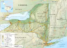 New York has a diverse geography. The state is bordered by New Jersey and Pennsylvania to the south and Connecticut, Massachusetts, and Vermont to the east. The state has a maritime border with Rhode Island, east of Long Island, as well as an international border with the Canadian provinces of Quebec to the north and Ontario to the northwest. The southern part of the state is in the Atlantic coastal plain and includes Long Island and several smaller associated islands, as well as New York City and the lower Hudson River Valley. The large Upstate New York region comprises several ranges of the wider Appalachian Mountains, and the Adirondack Mountains in the northeastern lobe of the state. The north–south Hudson River Valley and the east–west Mohawk River Valley bisect these more mountainous regions. Western New York is considered part of the Great Lakes region and borders on Lake Ontario, Lake Erie, and Niagara Falls. The central part of the state is dominated by the Finger Lakes, a popular vacation and tourist destination.