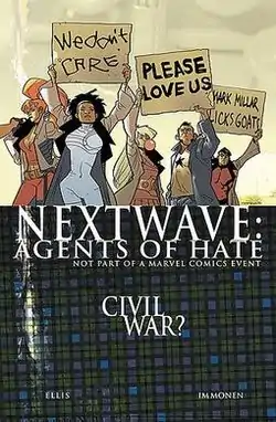 ![]() Nextwave #11. Art by Stuart Immonen. The cover parodies Marvel's Civil War. | |