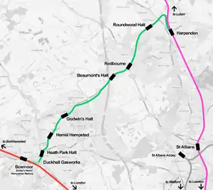 The Nickey line (also known as the Harpenden to Hemel Hempstead branch railway) is a disused railway that once linked the towns of Hemel Hempstead[1] and, initially, Luton but later Harpenden[2] via Redbourn, in Hertfordshire, England. The course of most of the railway has been redeveloped as a cycle and walking path, and is part of the Oxford to Welwyn Garden City route of the National Cycle Network. It is approximately nine miles (14 km) long.