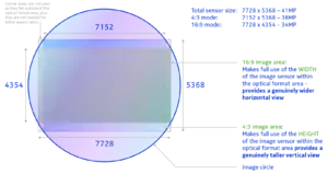 Depending on the aspect ratio chosen by the user, the sensor will use either 7728x4354 pixels (33.6 MP) for 16:9 images, or 7152x5368 pixels (38.4 MP) for 4:3 images when using the default camera software, although third-party apps exist that can capture the full resolution of the sensor. The output from the sensor is processed using the on-chip image processor, resulting in a lower-resolution image with pixel oversampling, lossless digital zoom, or a combination of both. The image processor highly reduces external processing needs and data rates as well as image noise (see noise shaping). At default settings, maximum zoom is 3x for stills (5 MP in a 16:9 aspect ratio) and 4x for video (1080p).