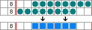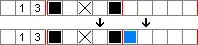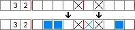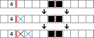 Consequently, the first block of four boxes definitely includes the third and fourth cells, while the second block of three boxes definitely includes the eighth cell. Boxes can therefore be placed in the third, fourth and eighth cells. Important note: When determining boxes in this way, boxes can be placed in cells only when the same block overlaps; in this example, there is overlap in the sixth cell, but it is from different blocks, and so it cannot yet be said whether or not the sixth cell will contain a box.