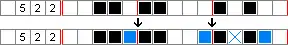 For example, considering a row of fifteen cells with boxes in the third, fourth, sixth, seventh, eleventh and thirteenth cell and with clues of 5, 2 and 2: