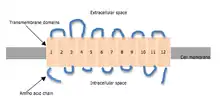 2) group and carboxyl (-COOH) group. In addition, there is a large extracellular loop located between TMD 3 and 4.[13][6][14] The protein is composed of 617 amino acids.[13]