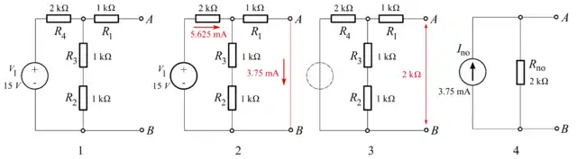To find the equivalent, the Norton current Ino is calculated as the current flowing at the terminals into a short circuit (zero resistance between A and B). This is Ino. The Norton resistance Rno is found by calculating the output voltage produced with no resistance connected at the terminals; equivalently, this is the resistance between the terminals with all (independent) voltage sources short-circuited and independent current sources open-circuited. This is equivalent to calculating the Thevenin resistance.