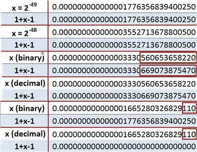 The last two examples illustrate what happens if x is a rather small number. In the second from last example, x = 1.110111⋯111 × 2−50; 15 bits altogether. the binary is replaced very crudely by a single power of 2 (in this example, 2−49) and its decimal equivalent is used. In the bottom example, a decimal identical with the binary above to the precision shown, is nonetheless approximated differently from the binary, and is eliminated by truncation to 15 significant figures, making no contribution to 1 + x − 1, leading to x = 0.[5]
