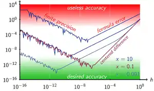 For basic central differences, the optimal step is the cube-root of machine epsilon.[6] For the numerical derivative formula evaluated at x and x + h, a choice for h that is small without producing a large rounding error is (though not when x = 0), where the machine epsilon ε is typically of the order of 2.2×10−16 for double precision.[7] A formula for h that balances the rounding error against the secant error for optimum accuracy is[8]
