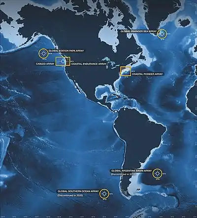 Locations of the global arrays were selected by a team of scientists (~300 people)[22] based on regions that are under-sampled and subject to extreme conditions (e.g., high winds and sea states) that are challenging for continuous or even frequent ship-based measurements. The planned global study sites include instrumented moorings and gliders in four locations: Argentine Basin;[23] Irminger Sea;[24] Southern Ocean;[25] and Station Papa.[26] The global arrays are developed and operated by Woods Hole and Scripps.