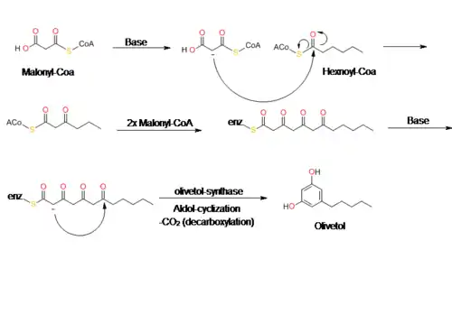 The data from Taura's study of OLS's enzyme kinetics show that OLS catalyzes a decarboxylative-aldol condensation to produce olivetol. This is similar to stilbene synthase’s (STS) mechanism for converting p-coumaroyl-CoA and malonyl-CoA to resveratrol. Although olivetol is the decarboxylated form of OLA, it is highly unlikely that OLS produces olivetol from OLA.[10][11] Crude enzyme extracts prepared from flowers and leaves did not synthesize olivetolic acid, but only yielded olivetol.[10] The exact mechanism of olivetol biosynthesis is as yet unsure, but it is possible that an OLA-forming metabolic complex forms along with OLS.[10] In addition, it also appears that OLS only specifically accepts starter CoA esters with C4 to C8 aliphatic side chains such as hexanoyl-CoA.[10][12]