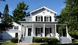 The Olof Johnson House is a historic house located at 408 NW 4th Street in Galva, Illinois. The house was built in 1863 for Olof Johnson, one of the trustees of the Bishop Hill Colony. In addition to his position within the colony, Johnson also played a significant role in Galva's founding and named the community after his birthplace of Gävle, Sweden. Johnson's house has an Italianate design, a popular style in the late 19th century. The house's wraparound front porch is supported by thin columns and features paired brackets along its roof; similar brackets can be found on the eaves of the house's cross gabled roof.[2]