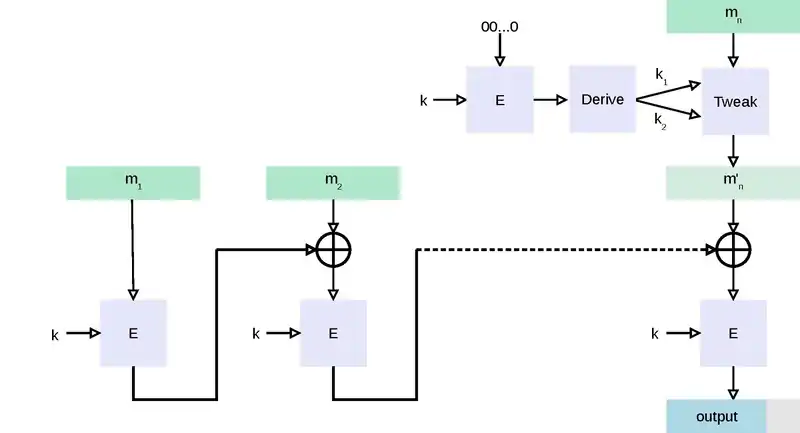 - If mn is a complete block then mn′ = k1 ⊕ mn else mn′ = k2 ⊕ (mn ∥ 10...02).
