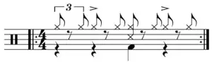 This may be seen in the drum notation for the typical rock drum pattern: