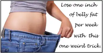 One weird trick, or one weird old tip, or one weird old trick and other variants are a form of clickbait advertising that has been common on the internet since around the late 2000s. The formula used in the advertisements was first applied to weight loss products but has since been extended to cures for problems including hair loss and diabetes.[1][2][3] A Federal Trade Commission investigation found that many of the ads sold "trial" packages that were never sent, and in 2011 it filed legal action against the promoters for defrauding millions of people.[4][5]