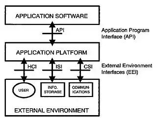 - External environment interface (EEI) : The EEI is the interface that supports information transfer between the application platform and the external environment, and between applications executing on the same platform. Consisting chiefly of protocols and supporting data formats, the EEI supports interoperability to a large extent. An EEI is categorized in accordance with the type of information transfer services provided.