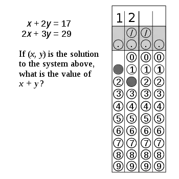 Modern optical answer sheets are read based on reflected light, measuring lightness and darkness. They do not need to be filled in with a number two pencil, though these are recommended over other types (this is due to the lighter marks made by higher-number pencils and the smudges from number 1 pencils). Black ink will be read, though many systems will ignore marks that are the same color the form is printed in.[11] This also allows optical answer sheets to be double-sided because marks made on the opposite side will not interfere with reflectance readings as much as with opacity readings.
