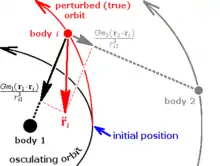 which, in theory, could be integrated twice to find . Since the osculating orbit is easily calculated by two-body methods, and are accounted for and can be solved. In practice, the quantity in the brackets, , is the difference of two nearly equal vectors, and further manipulation is necessary to avoid the need for extra significant digits.[8][9]