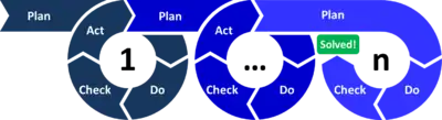 PDCA (plan–do–check–act or plan–do–check–adjust) is an iterative four-step management method used in business for the control and continuous improvement of processes and products.[1] It is also known as the Deming circle/cycle/wheel, the Shewhart cycle, the control circle/cycle, or plan–do–study–act (PDSA). Another version of this PDCA cycle is OPDCA.[2] The added "O" stands for observation or as some versions say: "Observe the current condition." This emphasis on observation and current condition has currency with the literature on lean manufacturing and the Toyota Production System.[3] The PDCA cycle, with Ishikawa’s changes, can be traced back to S. Mizuno of the Tokyo Institute of Technology in 1959.[4]