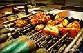 Chunks of paneer, a type of fresh cheese, are marinated in spices and are then arranged on a stick with capsicums, onions and tomatoes. These sticks are grilled in a tandoor and the dish is thereafter served hot, seasoned with lemon juice and chaat masala.[8] It is sometimes accompanied by salad or mint chutney.[9] Tikka dishes traditionally go well with mint chutney.[10] The paneer, though tender, has a crisp singe on the surface.[11]