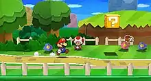 A major facet of Sticker Star's gameplay is the use of collectible stickers, which are used to gain abilities to progress through the game.[7] The player collects stickers that are found and peeled off from various areas in the environment.[7] Additionally, the player can purchase stickers using coins or receive them from non-playable characters (NPC).[8] The player has limited inventory space, with larger stickers taking up more room.[9] Stickers are used both in combat and for interacting with the environment.[10] The player can enter a state called "Paperization", which will lay the screen down flat to reveal additional secrets not visible regularly.[11] Real-world objects can be found, known in-game as "Things", such as baseball bats and scissors, that can be turned into special types of stickers called "Thing Stickers",[12] which are often needed to solve puzzles in the overworld.[10] For example, a Fan Thing Sticker can be placed in strategic areas in the environment and, when activated, creates wind that moves or destroys obstacles.[13]