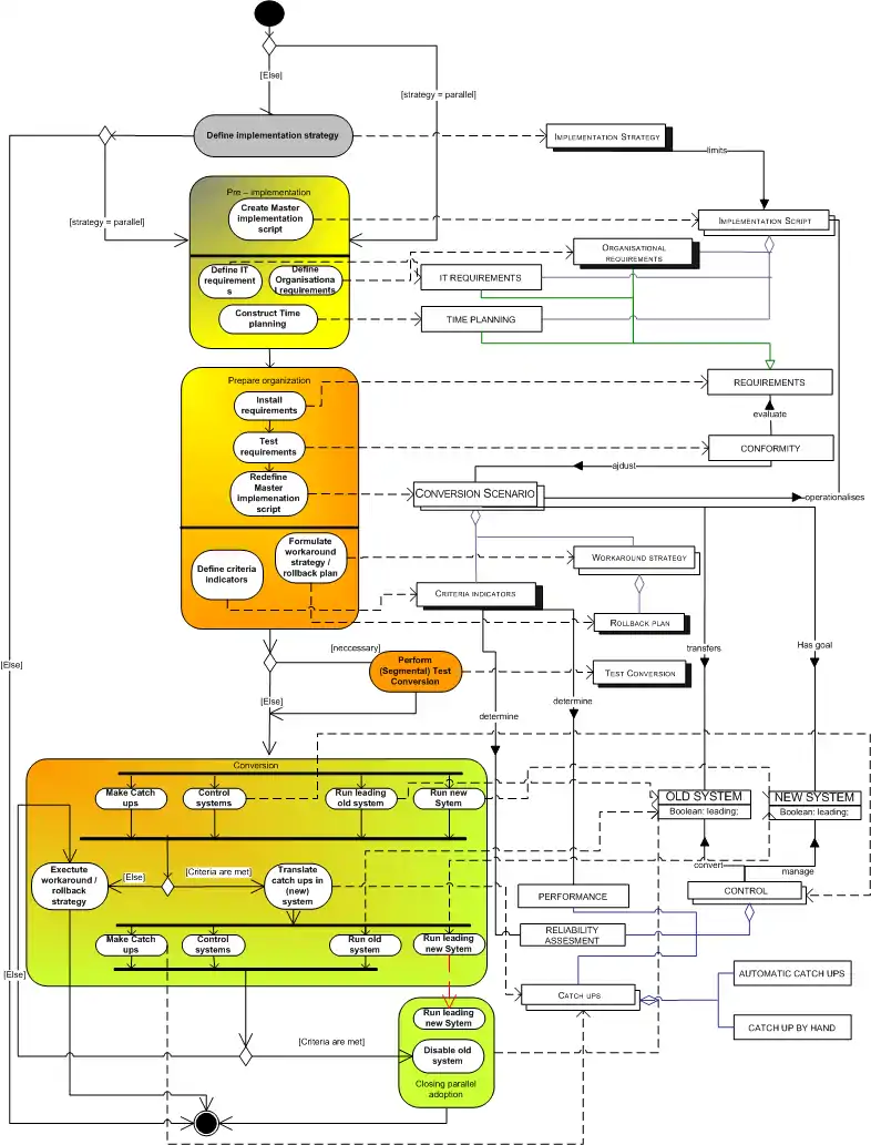| Conversion scenario | The redefined implementation script, taking into account the conformity to the requirements. Furthermore the conversion scenario consists of a workaround and rollback plan. The conversion scenario is the blueprint of the implementation project. (Rooijmans, 2003) |