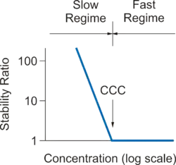 In the early stage of the aggregation process, the suspension mainly contains individual particle. The rate of this phenomenon is characterized by the aggregation rate coefficient k. Since doublet formation is a second order rate process, the units of this coefficients are m3s−1 since particle concentrations are expressed as particle number per unit volume (m−3). Since absolute aggregation rates are difficult to measure, one often refers to the dimensionless stability ratio W = kfast/k where kfast is the aggregation rate coefficient in the fast regime, and k the coefficient at the conditions of interest. The stability ratio is close to unity in the fast regime, increases in the slow regime, and becomes very large when the suspension is stable.