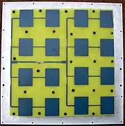 A patch antenna is a type of radio antenna with a low profile, which can be mounted on a flat surface. It consists of a planar rectangular, circular, triangular, or any geometrical sheet or "patch" of metal, mounted over a larger sheet of metal called a ground plane. They are the original type of microstrip antenna described by Howell in 1972;[1] the two metal sheets together form a resonant piece of microstrip transmission line with a length of approximately one-half wavelength of the radio waves. The radiation mechanism arises from discontinuities at each truncated edge of the microstrip transmission line.[2] The radiation at the edges causes the antenna to act slightly larger electrically than its physical dimensions, so in order for the antenna to be resonant, a length of microstrip transmission line slightly shorter than one-half the wavelength at the frequency is used. The patch antenna is mainly practical at microwave frequencies, at which wavelengths are short enough that the patches are conveniently small. It is widely used in portable wireless devices because of the ease of fabricating it on printed circuit boards. Multiple patch antennas on the same substrate (see image) called microstrip antennas, can be used to make high gain array antennas, and phased arrays in which the beam can be electronically steered.