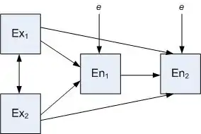 In the model below, the two exogenous variables (Ex1 and Ex2) are modeled as being correlated as depicted by the double-headed arrow. Both of these variables have direct and indirect (through En1) effects on En2 (the two dependent or 'endogenous' variables/factors). In most real-world models, the endogenous variables may also be affected by variables and factors stemming from outside the model (external effects including measurement error). These effects are depicted by the "e" or error terms in the model.