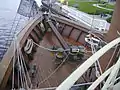 Peacemaker has a large deckhouse and spacious cabins finished in mahogany, modeled after the interior of Cutty Sark. She also has an innovative transom that can be lowered while in port to reveal a watertight bulkhead with two large doors opening into a cargo area and fully equipped workshop.