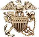 In the United States Navy, midshipmen, chief petty officers, and commissioned officers wear combination covers, but there are differences between the three types. Midshipmen at the United States Naval Academy, United States Merchant Marine Academy or in Naval Reserve Officers Training Corps (NROTC) units wear a combination cap with a gold chinstrap attached by gold buttons, with a gold fouled anchor device. A chief petty officer wears a combination cap with a black chinstrap attached with gold buttons, with a device consisting of a gold fouled anchor with silver block letters "USN" superimposed on the shank of the anchor, with the addition of one, two, or three stars at the top of the anchor if the wearer is a Senior Chief Petty Officer, a Master Chief Petty Officer, or the Master Chief Petty Officer of the Navy, respectively; while a commissioned officer wears a combination cap with a gold chinstrap attached by gold buttons, with an officer crest device, a silver federal shield over two crossed gold fouled anchors, surmounted by a silver eagle. Chief petty officer and junior commissioned officer visors are shiny black plastic without ornamentation. Officers O-5 (Commander) and above have gold embroidered oak leaves and acorns on a black felt-covered visor, with additional embroidery for flag officers (O-7, or rear admiral lower half, and above), referred to as "scrambled eggs." A thin plastic crown and metal hoop provides structure, and the covering fabric come in khaki or in white (since 1963, the white combination cap is worn with both white and blue uniforms). The black band around the cap includes a black circle extending upward on the front of the crown as a backing behind the device. The gold buttons on the sides of the cover that fasten the chin strap are of a design to match the gold buttons on the service dress jacket and the snaps on officer shoulder boards. For the former female cap the brim was folded up on both sides whereas the men's cap has no brim but a visor at the front; the female cap was discontinued October 2018.[16]