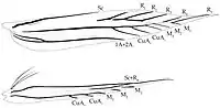 Pebobs species are very small to small moths in the family Cosmopterigidae. Forewing length of 2.9-4.3 mm. The external features are as in Cosmopterix. Wing venation with 12 veins in forewing and 7 veins in hindwing. Forewing with Sc and R1-R5 to costa; R5 stalked with M1; M1-CuA2 to termen; CuP very weak and not reaching termen; 1A+2A with basal fork, to dorsum. Hindwing Sc along costa and joining Rs at three-quarters; M1-CuA2 to termen; veins often not fully developed due to the narrow shape of the hindwing.[1]