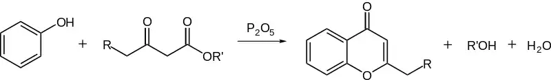 In a variation the reaction of phenols and beta-ketoesters and phosphorus pentoxide yields a chromone. This reaction is called Simonis chromone cyclization.[5][6] The ketone in the ketoester is activated by P2O5 for reaction with the phenol hydroxyl group first, the ester group in it is then activated for electrophilic attack of the arene.