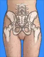 The pelvic region of the trunk is the lower part of the trunk, between the abdomen and the thighs.[1] It includes several structures: the bony pelvis, the pelvic cavity, the pelvic floor, and the perineum. The bony pelvis (pelvic skeleton) is the part of the skeleton embedded in the pelvic region of the trunk. It is subdivided into the pelvic girdle and the pelvic spine. The pelvic girdle is composed of the appendicular hip bones (ilium, ischium, and pubis) oriented in a ring, and connects the pelvic region of the spine to the lower limbs. The pelvic spine consists of the sacrum and coccyx.[1]