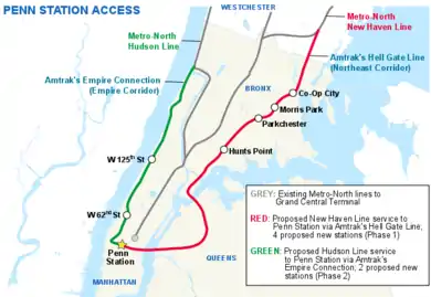 The project would complement the ongoing East Side Access project, and would commence in two separate phases. The first phase, which is in the planning stage, would add four new stations along the Hell Gate Line (part of the Northeast Corridor) in the Bronx and route some New Haven Line trains to Penn Station. The second phase, which is unfunded, would add two more stations along the Empire Connection/West Side Line on Manhattan's West Side; this would be served by the Hudson Line. An agreement for the first phase was reached in early 2019, and New Haven Line trains are tentatively expected to run into Penn Station in 2024 after East Side Access opens.