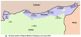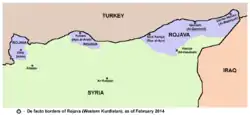 While many rebel groups clashed with the YPG, jihadist and Salafist groups did so the most often.[17] The YPG proved to be the only Kurdish militia able to effectively resist the fundamentalists.[18] While the YPG protected the Kurdish communities it was able to extract a price: it prevented the emergence of new, rival militias and forced existing ones to cooperate with or join the YPG forces on its terms.[19] This was how the Islamist attacks enabled the YPG to unite the Syrian Kurds under its banner[20] and caused[21] it to become the de facto army of the Syrian Kurds.[22][23][24][25]